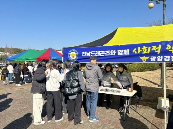 (전남=NSP통신) 김성철 기자 = 광양경찰서(서장 최병윤)는 지난 9일 전남드레곤즈 개막식 축구경기 관람하기 위해 찾아온 시민들 대상으로 실종예방을 위한 사전지문등록과 아동학대,학교폭력 예방 홍보 캠페인을 실시했다고 밝혔다.
