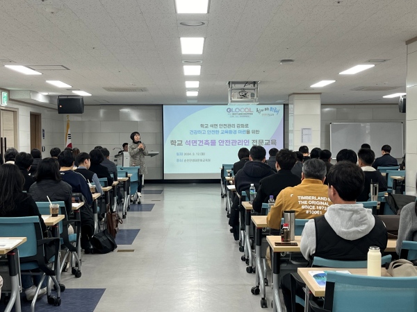 12일 순천만생태문화교육원에서 열린 이번 전문교육에는 학교 석면건축물 안전관리인을 비롯해 교육지원청 업무담당자 100여 명이 참여했다.