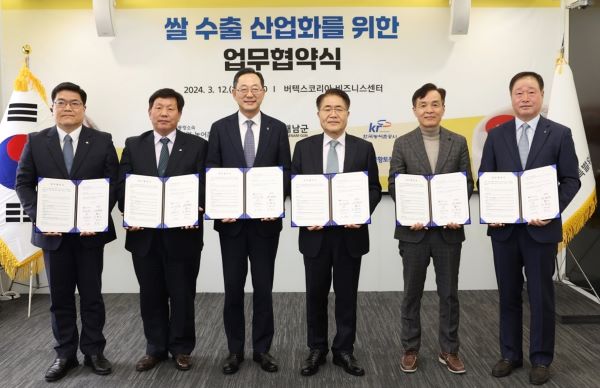 해남군과 대통령직속 농어업·농어촌특별위원회, 한국농어촌공사, CJ제일제당, 옥천농협, 땅끝황토친환경영농조합 등 6개 기관·생산자단체·기업은 12일 쌀 수출 산업화를 위한 업무협약을 체결했다.
