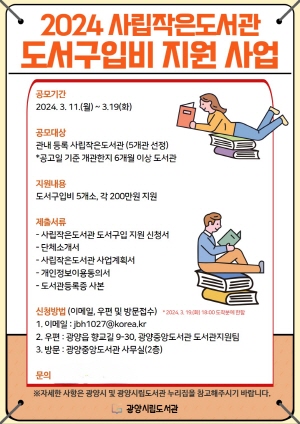 (전남=NSP통신) 김성철 기자 = 광양시는 3월 11일~19일까지 ‘2024년 사립작은도서관 도서구입비 지원 사업’에 참여할 지역 내 사립작은도서관을 모집한다고 밝혔다.