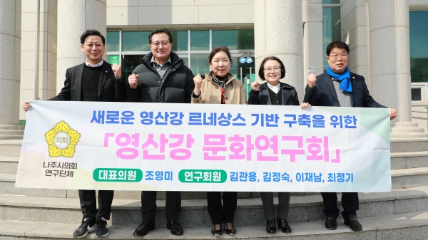 ‘영산강 문화 연구회’는 새로운 영산강 르네상스 기반 구축을 위해 영산강의 인문학적 가치를 연구하고 문화 콘텐츠를 개발하기 위해 조영미 의원이 대표를 맡고 김정숙·이재남·김관용·최정기 의원 총 5명으로 구성돼 있다.