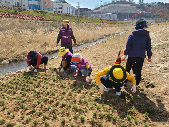 행사는 지난 2월 28일 성황천 유채꽃 파종에 이은 두 번째 활동으로, 골약동주민자치위원회와 성황 푸르지오 시니어클럽 회원 및 세방 광양지사 직원 등 30여 명이 참석해 꽃잔디 식재 활동을 진행했다.