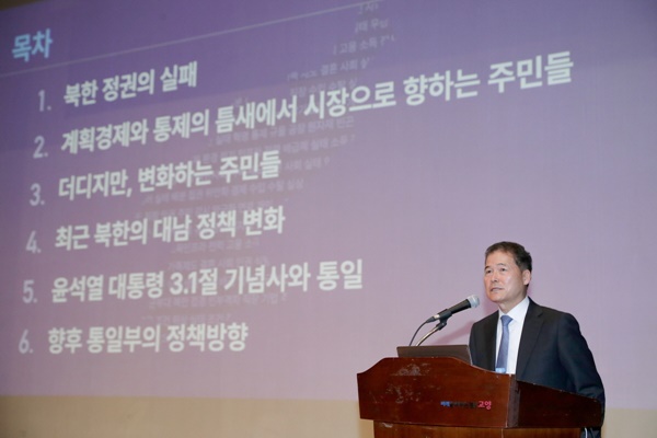 김 장관은 지난 2월 발간된 ‘북한 경제·사회 실태 인식보고서’를 바탕으로 강연을 진행했다.