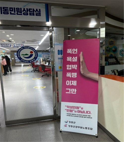 (전남=NSP통신) 김용재 기자 = 장흥군과 군공무원노동조합이 최근 군청 현관 및 보건소, 10개 읍·면에 악성 민원 근절 베너를 설치했다.