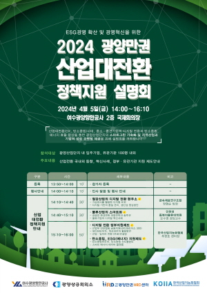 (전남=NSP통신) 김성철 기자 = 여수광양항만공사(사장 박성현, 이하 공사)는 4월 5일 여수광양항만공사 국제회의장(2층)에서 광양만권 중소·중견기업을 대상으로 '2024 광양만권 산업대전환 정책지원 설명회'를 개최한다고 밝혔다.