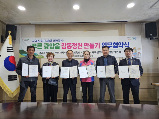 이번 협약은 푸른 숲과 꽃이 어우러진 녹색공간을 확충하고 쾌적한 광양읍 만들기를 위해 마련됐으며, 참여 사회단체는 광양읍 주민자치위원회, 광양읍 체육회, 광양읍 청년회, 광양읍 새마을부녀회, 광양읍 생활개선회 등이다.