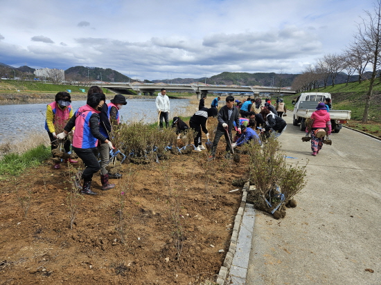 협약 후, 5개 단체 회원 60여 명과 읍사무소 직원들이 합심해 서천변 일원에서 ‘철쭉심기 행사’를 진행해 면적 860㎡에 철쭉 1500여 그루를 심었다.