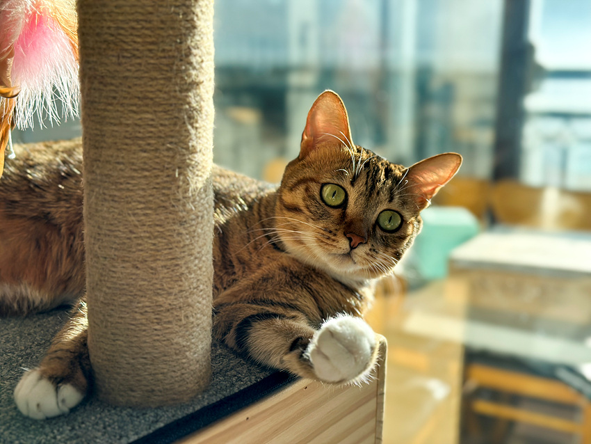 캣타워에서 재롱을 부리고 있는 반려묘 가을이 모습. (사진 = 조이호 기자)