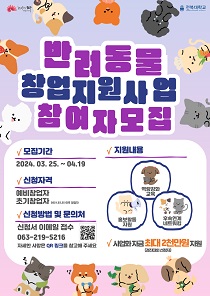 이에 따라 창업지원단은 전주시의 지원을 받아 향후 10개월 동안 반려동물산업 분야의(예비)창업자 및 3년 이내 창업기업을 발굴하고, 창업에 필요한 교육, 멘토링, 창업자금 등을 지원할 계획이다.