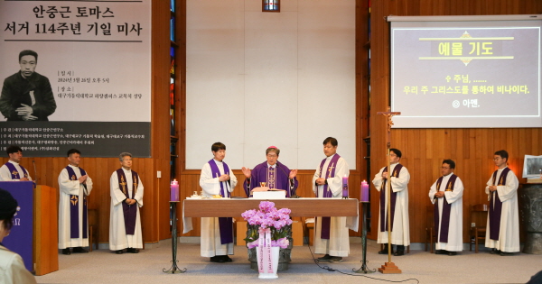 (경북=NSP통신) 김대원 기자 = 대구가톨릭대(총장 성한기)는 지난 26일 교내 교목처 성당에서 안중근(토마스) 의사 순국 114주기 추모미사를 봉헌했다.