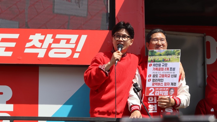 한동훈 비대위원장은 이날 오전 안성 공도지구대 사거리에서 열린 유세에서 “안성 철도를 비롯한 약속을 김학용 후보와 함께 지키겠다”고 밝혔다.