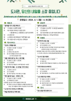 ▲전자책 독서왕 선발 ▲「4월, 꽃과 함께 독서해요」인스타그램 이벤트 ▲이야기에 BOOK 빠지다 ▲신규 회원가입 이벤트 ▲청소년을 위한 원화 전시 등 다채롭고 풍성한 이벤트도 마련했다.