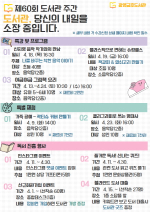 (전남=NSP통신) 김성철 기자 = 광양시립도서관은 제60회 도서관주간(4월 12일~18일)을 맞이해 4월 한 달 동안 작가 초청 강연, 특강, 공연, 전시 등 풍성하고 다양한 독서문화행사를 개최한다.