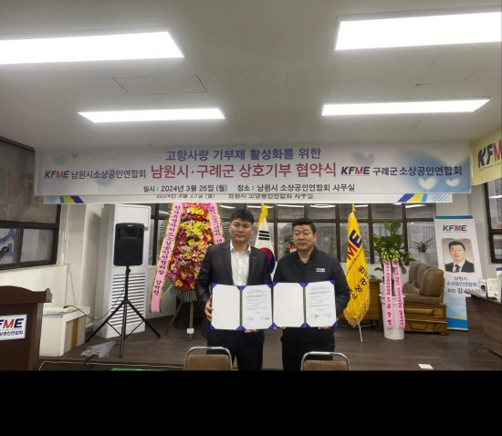 (전남=NSP통신) 김성철 기자 = 전남 구례군과 전북 남원시의 소상공인연합회 회원들이 고향사랑기부제 활성화와 지역 상생협력을 위해 상호기부에 나섰다.