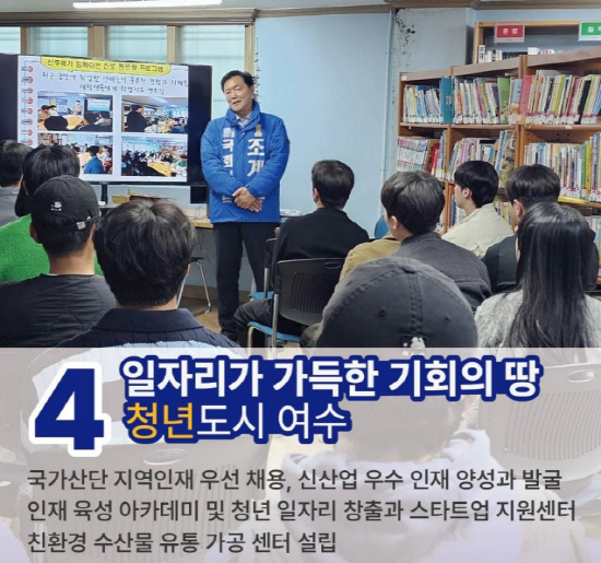 조 후보는 “청년정책은 여수 산업의 다양성을 높이고, 여수의 인구 증가에도 큰 역할을 하리라 생각한다”며 청년도시 여수 정책의 적극 추진을 다짐했다.