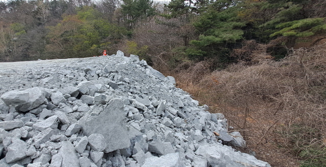 암석 처리 현장에는 산더미처럼 높이 발생 암석들이 대부분 방진덮개나 일부 방진망 등 기본 조치도 없이 높이 쌓여 있었다.