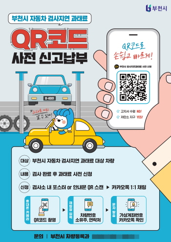 부천시는 검사지연 과태료 대상이 되는 차주가 검사소 내 포스터에 인쇄된 큐알(QR)코드를 찍고 카카오톡 1:1 채팅창에 차량번호, 소유주, 연락처를 입력하면 카카오톡으로 20% 감경된 고지서, 사전통지 안내문, 가상계좌번호를 받을 수 있도록 ‘과태료 사전신고 시스템’을 구축해 운영 중이다.