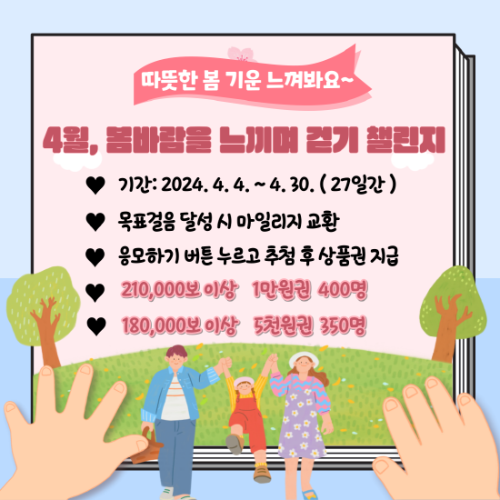 서영옥 건강증진과장은 “이번 챌린지를 통해 따뜻한 봄을 만끽하고 꾸준한 걷기 습관 정착으로 건강도 지키시기를 바란다”며 “시민들의 많은 관심과 참여를 당부한다”고 말했다.