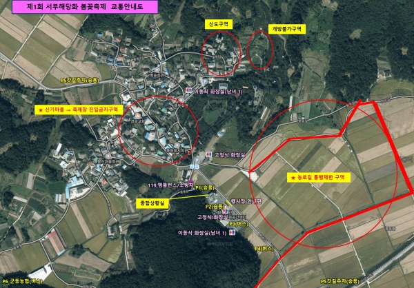특히 신기마을에서 마을뒷길을 통해서는 축제장으로 진입할 수 없으므로 주차장으로 가기 위해서는 반드시 남미륵사 삼거리로 유도하는 교통안내에 따라 주행해야 한다.
