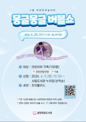 (전남=NSP통신) 김성철 기자 = 광양희망도서관이 문화가 있는 날을 맞아 4월 24일 오후 5시 꿈나무극장에서 어린이 100여 명을 대상으로 ‘몽글몽글 버블쇼’를 운영한다고 밝혔다.