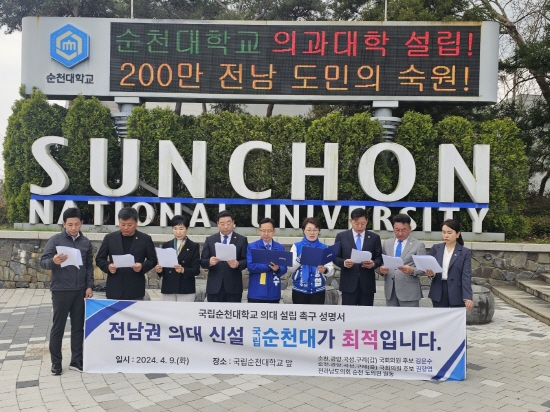 더불어민주당 권향엽 후보와 김문수 후보는 순천대학교 앞에서 의대 설립을 촉구하는 공동 성명서를 발표했다. 전라남도의회 순천 도의원들도 동참했다.