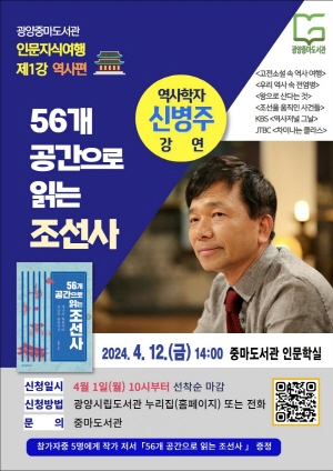 (전남=NSP통신) 김성철 기자 = 광양중마도서관이 4월 12일 오후 2시 ‘인문지식여행’ 특강의 첫 번째 시간으로 역사학자 신병주 교수 초청 강연을 연다.