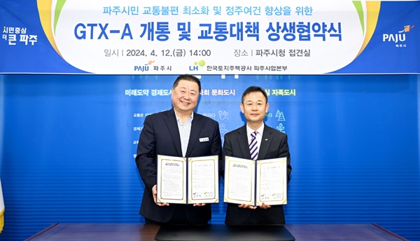 (서울=NSP통신) 강은태 기자 = 파주시와 한국토지주택공사(LH) 파주사업본부는 12일 ‘수도권 광역급행철도(GTX)-A 개통 및 파주운정 3지구 교통대책 마련을 위한 상생 업무협약’을 체결했다.