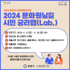 (전남=NSP통신) 김성철 기자 = 광양문화도시센터(이하 센터)가 2024년 문화원님길 사업을 위해 ‘시민 궁리랩(Lab.)’ 참여자를 모집한다고 밝혔다.