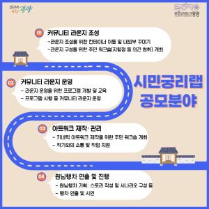 3년 차가 되는 올해는 4개 분야로 사업을 세분화해 ▲커뮤니티 라운지 조성 ▲커뮤니티 라운지 운영 ▲아트워크 제작 및 관리 ▲원님 행차 연출 및 진행 등을 계획하고 있다.