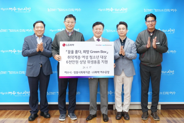 (전남=NSP통신) 서순곤 기자 = LG화학 여수공장(주재임원 이현규 상무)은 17일 여수시청 및 쌍봉종합사회복지관에서 관내 취약계층 여성청소년 500명을 대상으로 친환경 위생용품을 지원하는 ‘꿈을 품다, 희망 Green Box’ 활동을 진행했다.