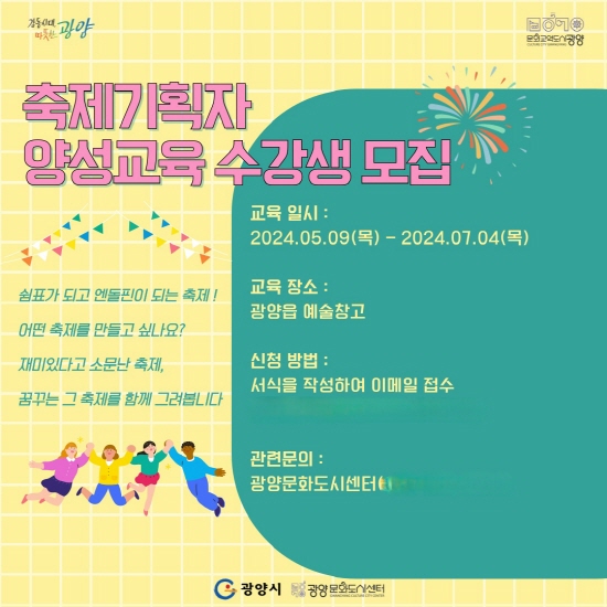 광양문화도시센터는 5월부터 광양을 대표하는 주요 축제를 더욱 강화하기 위한 ‘축제기획자 양성교육’ 프로그램을 운영한다고 밝혔다.