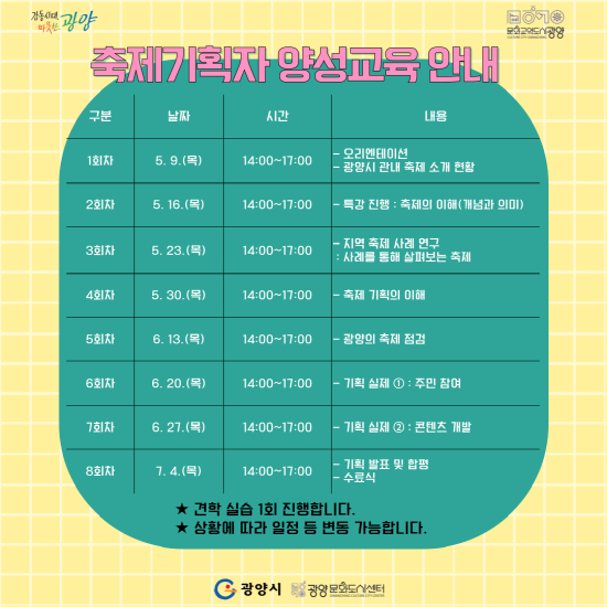 이번 프로그램은 총 8회차로 운영되며, 축제의 본질부터 축제 구성 요소, 광양 축제의 허와 실, 과제와 개선안에 대해 전문가들의 강의와 워크숍을 통해 축제를 준비하는 관계자들과 시민들은 열띤 토론의 장을 마련할 예정이다.