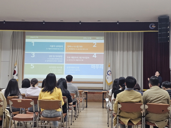 교육은 청백-e시스템 운영지원단 전문 강사를 초청해 ▲자율적 내부통제 개요 ▲청백-e 시스템 권한 신청 ▲모니터링 처리 흐름 및 방법 ▲시스템 메뉴별 기능과 자기진단 제도 이용 방법 등의 내용을 다뤘다.