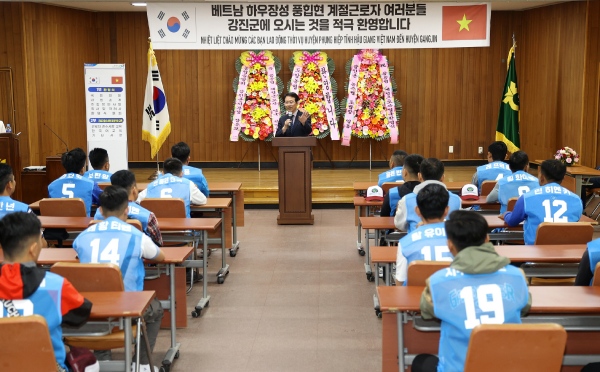 이들은 강진군의 국제우호교류 도시인 베트남 하우장성 풍힙현에서 지난 22일 김해공항을 통해 입국한 계절근로자 20명과 관계 공무원 3명 등으로, 강진원 군수를 비롯한 윤영남 군의원, 도암농협장 및 기관·단체장 등 30여 명이 참석해 따뜻하게 맞았다.