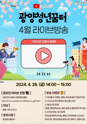 이번 라이브 방송은 4월 26일 오후 2시~3시까지 1시간 동안 광양청년꿈터 유튜브를 통해 진행되며 ▲광양청년꿈터 소식 및 다양한 청년 지원 시책 안내 ▲광양청년꿈터 운영 프로그램 소개 ▲광양시 청년들의 특별한 사연을 소개할 예정이다.