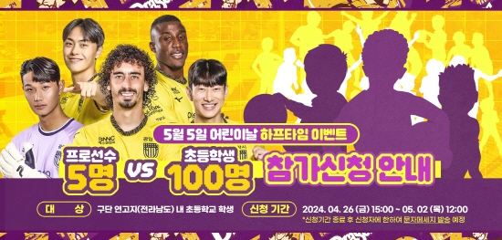 (전남=NSP통신) 김성철 기자 = 전남드래곤즈가 2024년 5월 5일 어린이날 홈경기 맞아 하프타임 이벤트인 프로선수 5명 vs 어린이 100명 축구대결을 진행하며 함께할 어린이 참가자를 모집한다.