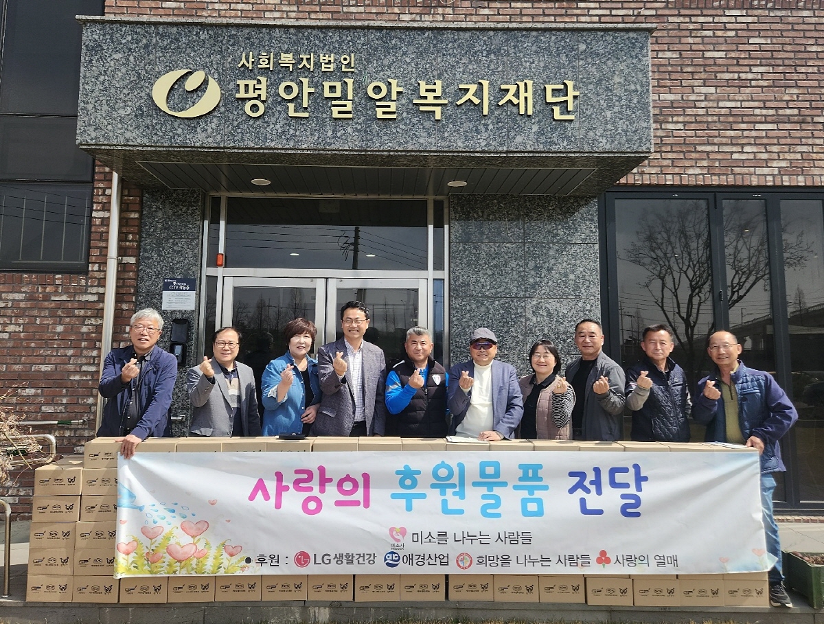 25일 둥글개봉사단은 이찬종 이삭애견훈련소 소장, 김미령 소년보호위원회 회장과 법무법인 미평여자학교에 세탁용품과 위생용품 전달식을 가졌다.