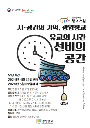 (전남=NSP통신) 김성철 기자 = 광양시는 국가유산청(문화재청) 공모사업 ‘2024년 우리고장 국가유산 활용사업’의 일환으로 ‘향교·서원 문화유산 활용사업 - 시·공간의 기억, 광양향교’를 5월 11일부터 광양향교에서 운영한다고 밝혔다.