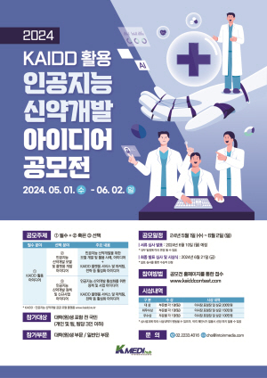 케이메디허브 신약개발센터는 인공지능 신약개발 활성화를 위해 ‘2024 KAIDD 활용 인공지능 신약개발 아이디어 공모전’ 을 통한 대국민 아이디어를 모집한다.