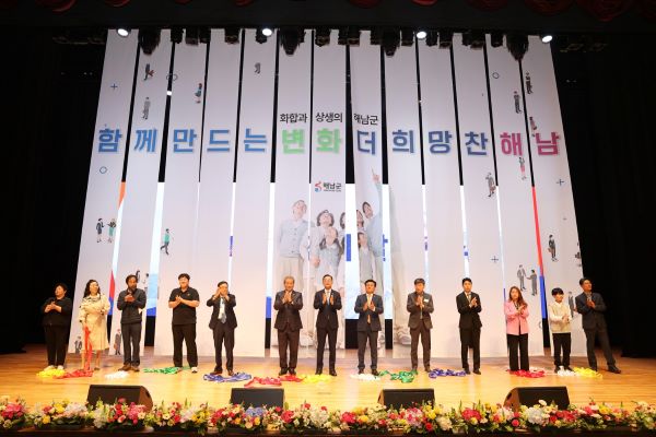 ‘함께 만드는 변화, 더 희망찬 해남’을 주제로 열린 군민의 날 기념식은 군민과 향우들이 화합하여 군정 발전의 의지를 다지는 기념행사와 함께 군정발전 유공자에 대한 시상식 등이 진행됐다.