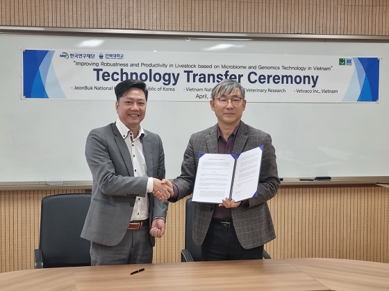 (전북=NSP통신) 서희경 기자 = 전북대학교 이학교 교수 연구팀(동물생명공학과)이 최근 베트남 식품에서 분리한 신규 고초균을 활용한 미생물 제제의 산업화를 위해 베트남 수의동물약품 국영기업인 벳바코(Vetvaco)사에 기술을 이전했다고 1일 밝혔다.