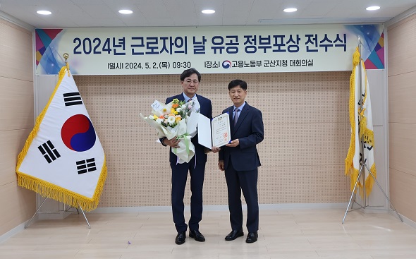 (전북=NSP통신) 김광석 기자 = OCI 군산공장은 지난 2일 광주지방고용노동청 군산지청에서 열린 ‘2024년 근로자의 날 유공 정부포상 전수식’에서 장육남 군산공장 노조위원장이 대통령상을 수상했다고 3일 밝혔다.