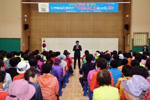 대덕읍 복지회관에서 진행된 이 날 행사는 노인일자리 참여자 어르신 카네이션 달아드리기, 레크리에이션, 선물 꾸러미 증정 등의 시간을 가졌다.