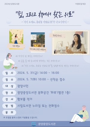 김미라 도서관과장은 “가정의 달을 맞아 작가와의 만남을 통해 시민들의 글쓰기 능력 향상과 지친 삶 속에서 책을 통해 위로받기를 바란다”며 “시민들의 많은 관심과 참여 부탁드린다”고 전했다.