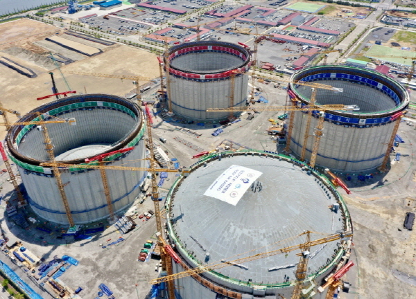 한국가스공사는 지난 9일 당진LNG생산기지에서 국내 최대 용량인 27만㎘ LNG 저장탱크의 지붕 상량(Roof Air-Raising)을 성공적으로 완료했다고 밝혔다. 당진기지 저장탱크 전경 (사진 = 한국가스공사)