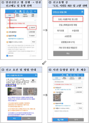 ‘빗물받이 막힘 집중 신고’는 생활 속 위험요소를 누구나 신고할 수 있도록 구축한 ‘안전신문고’ 앱을 실행하고 안전신고 메뉴에서 ‘도로, 시설물 파손 및 고장’을 선택한 다음 사진이나 동영상을 첨부해 제출하면 된다.