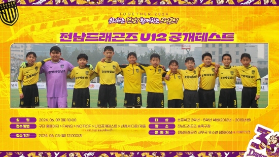 이번 2024 전남드래곤즈 U12 공개테스트는 6월 9일 광양시 송죽구장에서 진행된다. 참가신청 방법은 구단 홈페이지 NOTICE에서 참가신청서를 다운 받은 후 작성하여 이메일로 접수하면 된다.