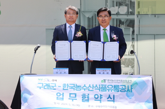 (전남=NSP통신) 김성철 기자 = 구례군은 지난 16일 한국농수산식품유통공사(aT)와 건강한 농업·농촌 실현과 탄소중립 실천 협력체계 구축을 위한 업무협약을 체결했다고 밝혔다.