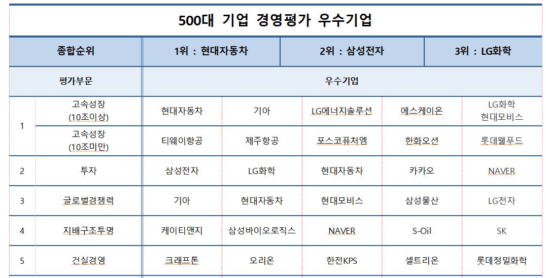 이밖에 글로벌경쟁력 부문에서는 기아, 현대자동차, 현대모비스, 삼성물산, LG전자가 우수기업으로 선정됐고, 건실경영 부문은 크래프톤, 오리온, 한전KPS, 셀트리온, 롯데정밀화학이 우수기업으로 뽑혔다.