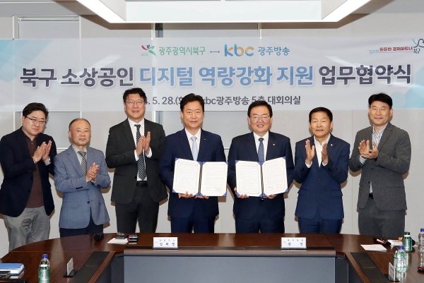 28일 북구에 따르면 이 날 KBC 광주방송국 5층 대회의실에서 북구와 KBC(대표이사 임채영)가 소상공인 온라인 마케팅 강화에 맞손을 잡고 ‘소상공인 디지털 역량 강화 지원 업무 협약’을 체결했다.